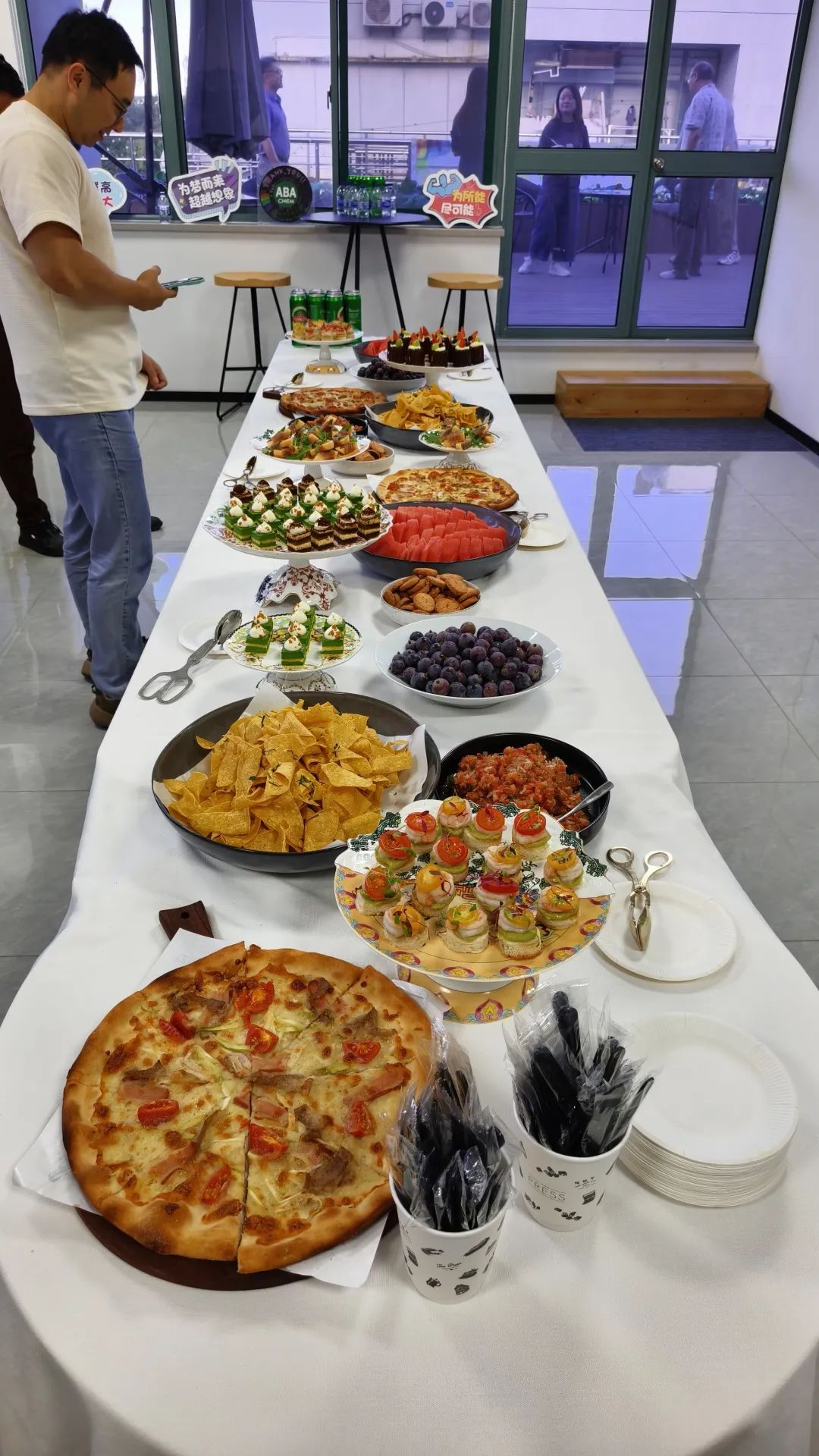 活动现场满是鲜活的烟火气,烤架上的食材滋滋作响,肉串、鸡翅等食材在炭火的炙烤下裹上诱人焦香,轻轻勾动着每个人的味蕾。一旁的餐台也摆得满满当当,各式披萨、精致甜点、新鲜水果以及清爽饮料供大家随心选择,满足了不同口味需求。