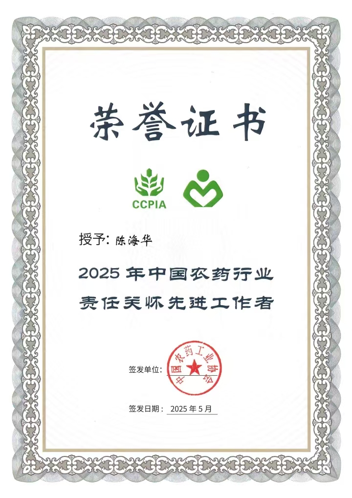 近日,中国农药工业协会公布 2025 年中国农药行业责任关怀评选结果,雅本化学股份有限公司凭借在绿色发展与社会责任领域的卓越实践,荣膺“2025 年中国农药行业责任关怀优秀践行单位”称号;南通雅本化学有限公司执行董事兼总经理陈海华因在责任关怀体系建设中的突出贡献,被授予“2025 年中国农药行业责任关怀先进工作者”荣誉。这一行业权威评选旨在表彰在责任关怀实践中表现优异的企业与个人,鼓励更多的企业和个人了解、认可并实施责任关怀。