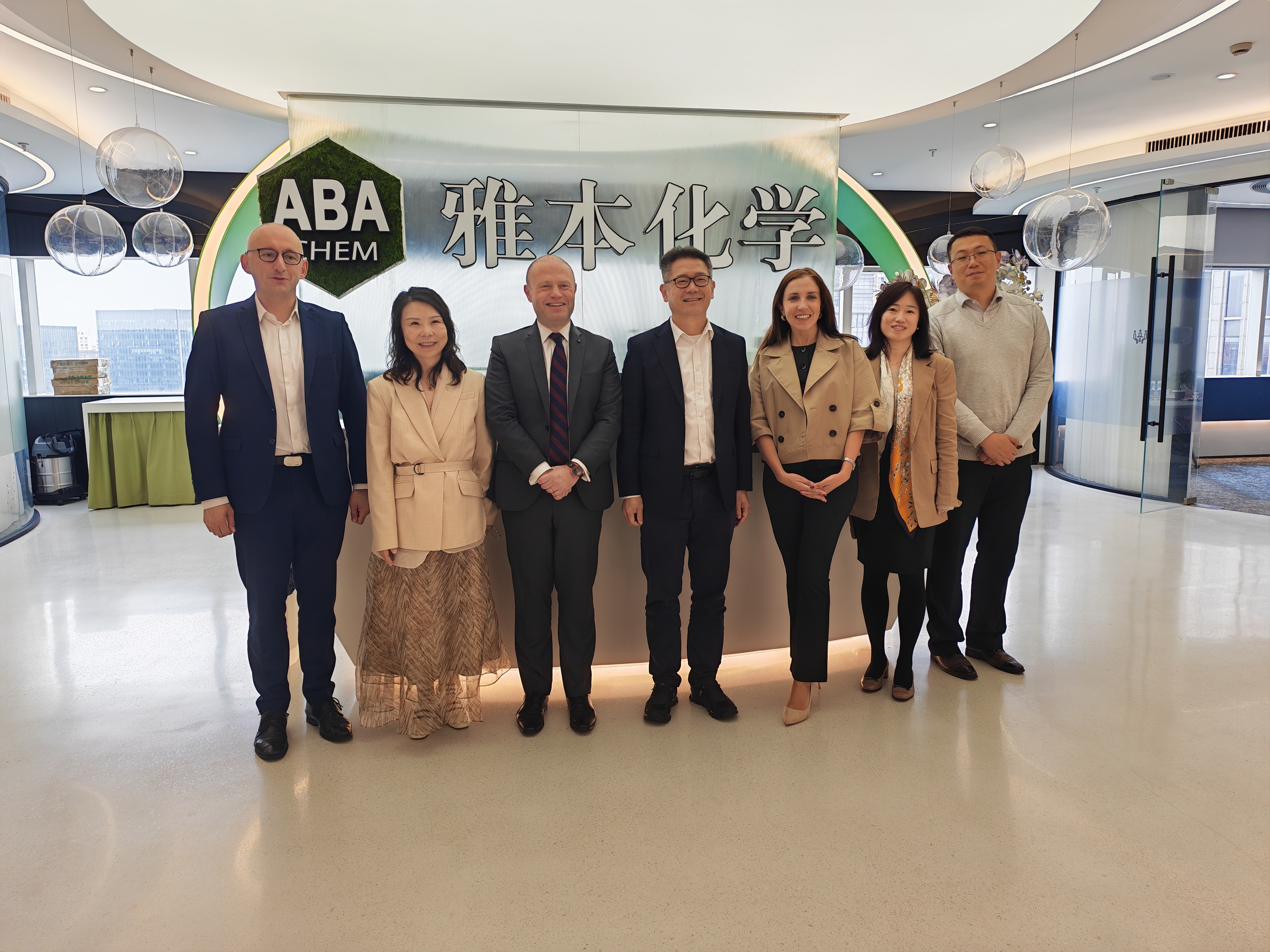 今日,雅本化学股份有限公司(以下简称 “雅本化学”)上海总部迎来了一批尊贵的国际客人。马耳他前总理 Dr. Joseph Muscat 先生、马耳他驻上海总领事 Lisa Azzopardi 以及律师 Charlon Gouder 先生及随行同事应邀到访。雅本化学董事长兼总经理蔡彤先生、董事兼常务副总经理王卓颖女士、农药事业部门总监张慧女士、医药部门销售经理奚正生先生热情接待了来访嘉宾,双方就马耳他在医药、农化及环保领域的战略合作进行了深入的会谈。