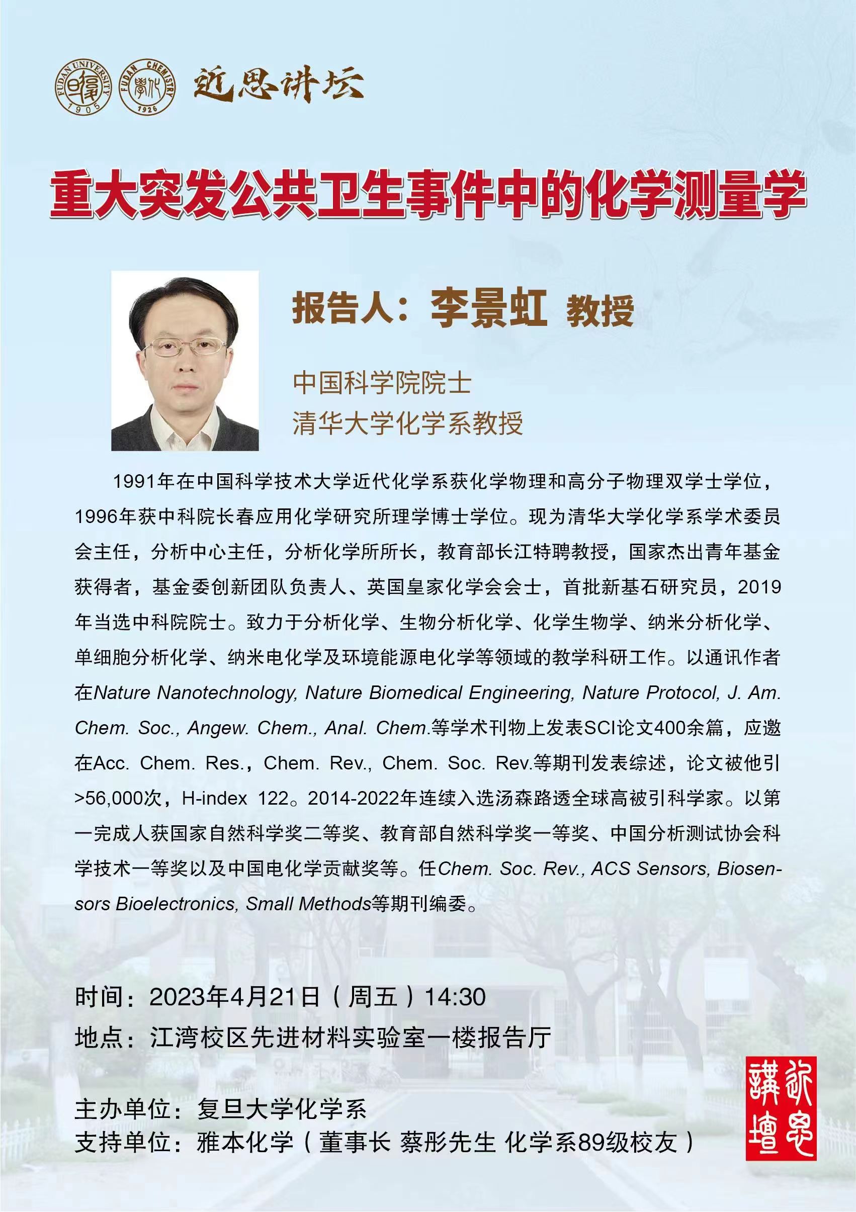 4月21日下午,复旦大学化学系“近思讲坛”第二十四讲在江湾校区先进材料实验室一楼报告厅顺利举行。中国科学院院士、清华大学化学系教授李景虹应邀作了题为“重大突发公共卫生事件中的化学测量学”的学术报告。报告会由化学系主任周鸣飞教授主持,化学系师生及校友约200人参加。